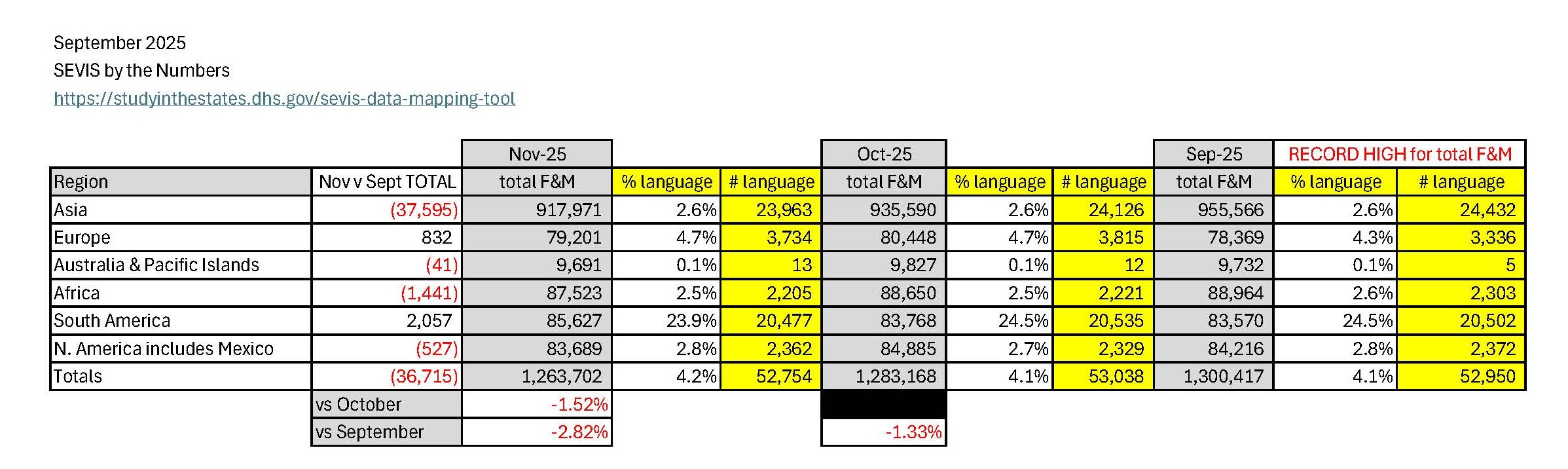 Addendum: On Friday of International Education week (11/20/2025), SEVIS released its November report. Below is a comparison November/October/September. September is the record high for TOTAL F&M visas in the USA
